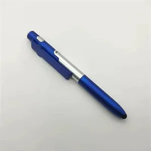 4 in 1 multi-purpose stylus pen. Multi-purpose twist-action ballpoint pen. Mini LED flashlight and a phone or tablet holder. Soft silicone tip for use with touchscreen devices. It is suitable for travel and can also be used as a flashlight. Simple operation: each function can be used with one hand. Black or blue ink. Tip: 1/36" or 2/50.