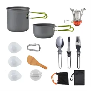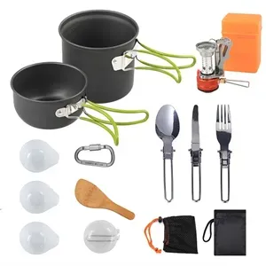 10-piece camping cookware set includes 1 pot,1 mini stove,1 spoon + 1 fork,1 knife,1 Bamboo shovel,3 Plastic cups,1 plastic bowl,1 carabiner.