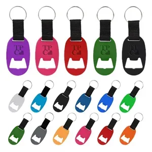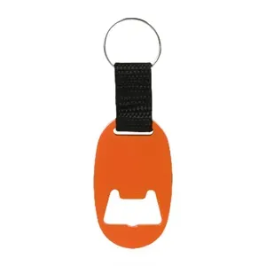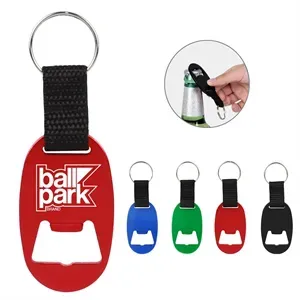 This oval shape bottle opener keychain is made of good quality aluminum metal material with woven web strap.